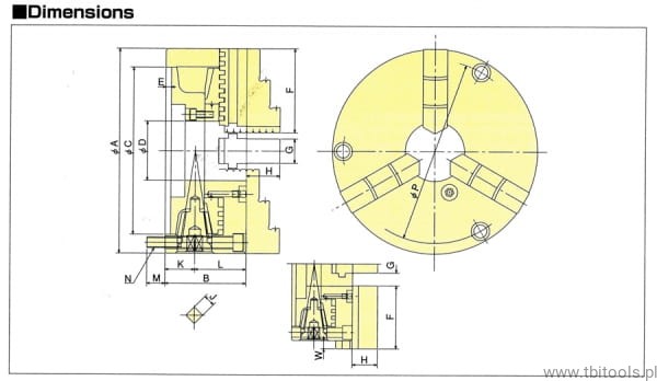 Wielofunkcyjny uchwyt samocentrujący z tarczą spiralną o średnicy 232 mm z wewnętrzną i zewnętrzną średnicą chwytu.